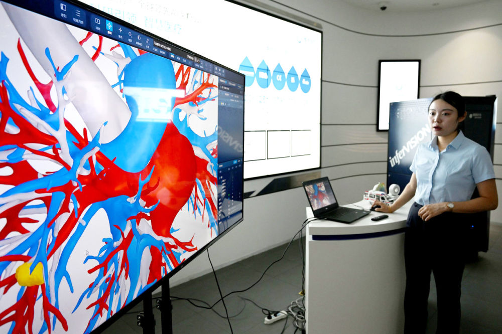 工作人员在位于安徽省合肥市的“中国声谷”体验中心介绍一款智慧医疗产品。新华社记者黄博涵 摄