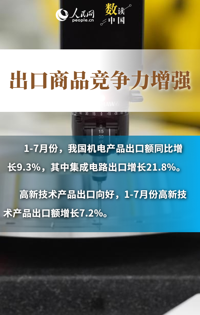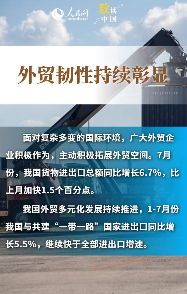 进出口规模创历史新高、“朋友圈”不断扩大、民营企业持续创新……数据显示,今年前7个月,我国货物贸易进出口总值25.7万亿元,同比增长3.5%。在外部挑战之下,我国货物进出口持续增长,展现出较强韧性和活力,为世界经济复苏注入了中国力量。