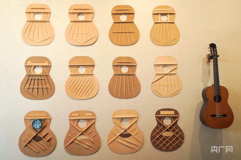 松滋市文化创新产业园内的各式吉他面板(央广网记者邓子依 摄)