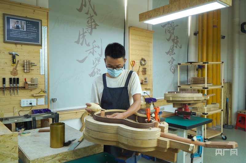 制琴师正在手工制作吉他(央广网记者邓子依 摄)