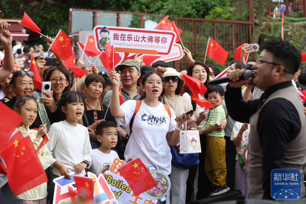 ↑ 10月1日,游客在四川省乐山市大佛景区佛头广场合唱歌曲《我和我的祖国》。新华社发(李华时摄)