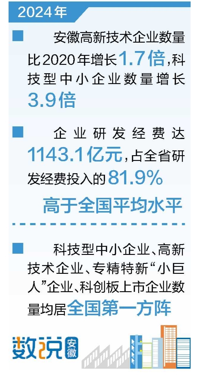构建以企业为主体的科技创新体系。2024年,安徽高新技术企业数量比2020年增长1.7倍,科技型中小企业数量增长3.9倍。企业研发经费达1143.1亿元,占全省研发经费投入比重约81.9%,高于全国平均水平。2024年,科技型中小企业、高新技术企业、专精特新“小巨人”企业、科创板上市企业数量均居全国第一方阵。