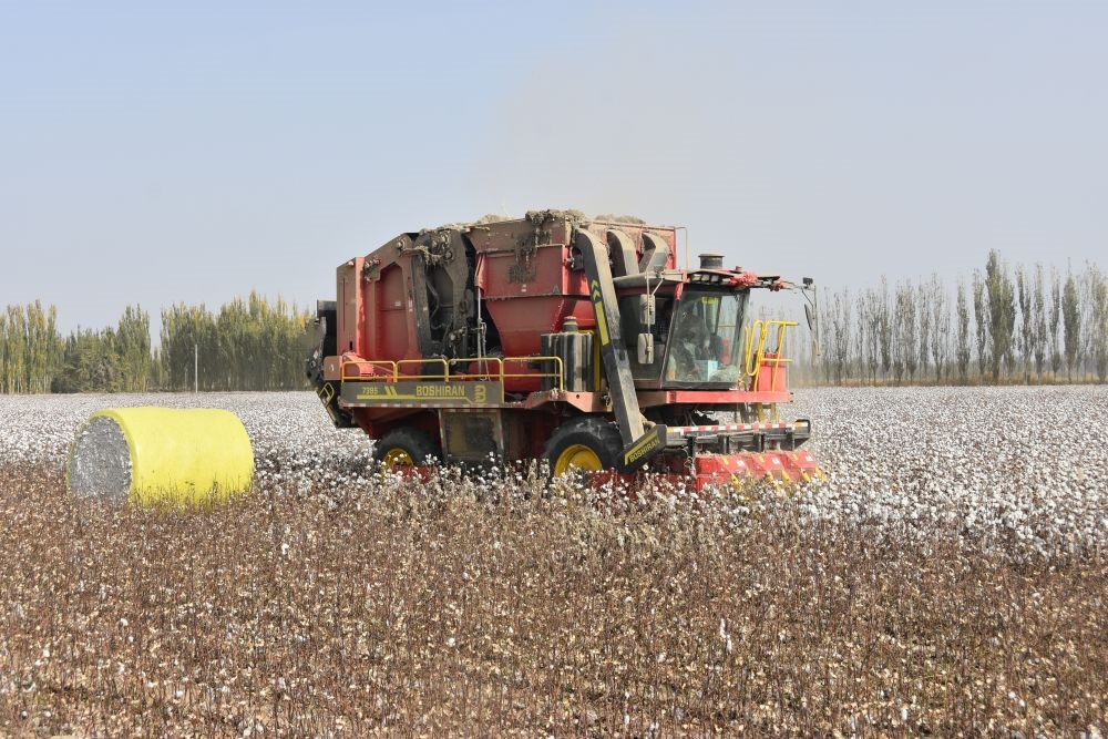 10月21日,采棉机在新疆阿克苏地区沙雅县的棉田中工作,旁边是刚采收打包好的棉花。新华社记者贾钊 摄