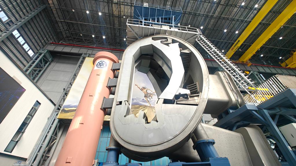 “夸父”园区11号厂房巨型的穹顶下,一个硕大的“橘子瓣”——八分之一真空室静卧中央。未来,八个“橘子瓣”将精准拼接,构成下一代“人造太阳”的核心舱室。“从预研、研制、调试到正式建成并通过验收,我们历时十年攻关,形成40余项发明专利。”八分之一真空室及总体安装系统负责人刘志宏自豪地说,最近几个月,“橘子瓣”旁愈加热闹,偏滤器原型件给它装上超强“盾牌”,遥操作系统测试平台的机械臂徐徐展开,如夸父伸出巨臂,精准探入装置内部进行检测。