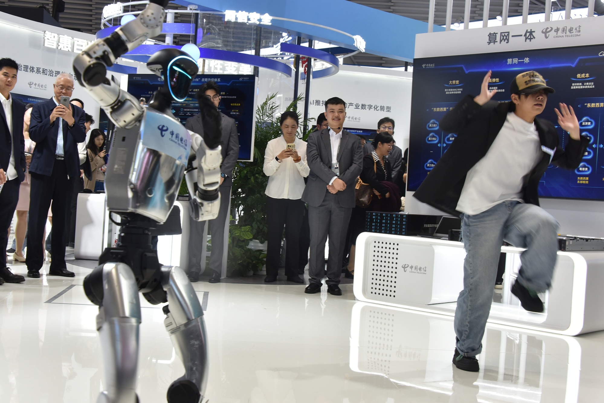 浙江乌镇,“互联网之光”博览会现场,机器人与观众互动