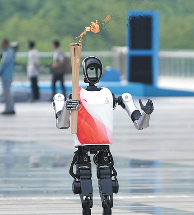 人形机器人“夸父”在传递火炬。