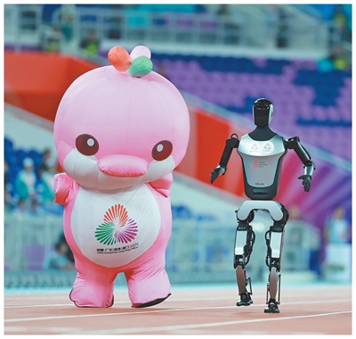 十五运会赛场,吉祥物与机器人互动。