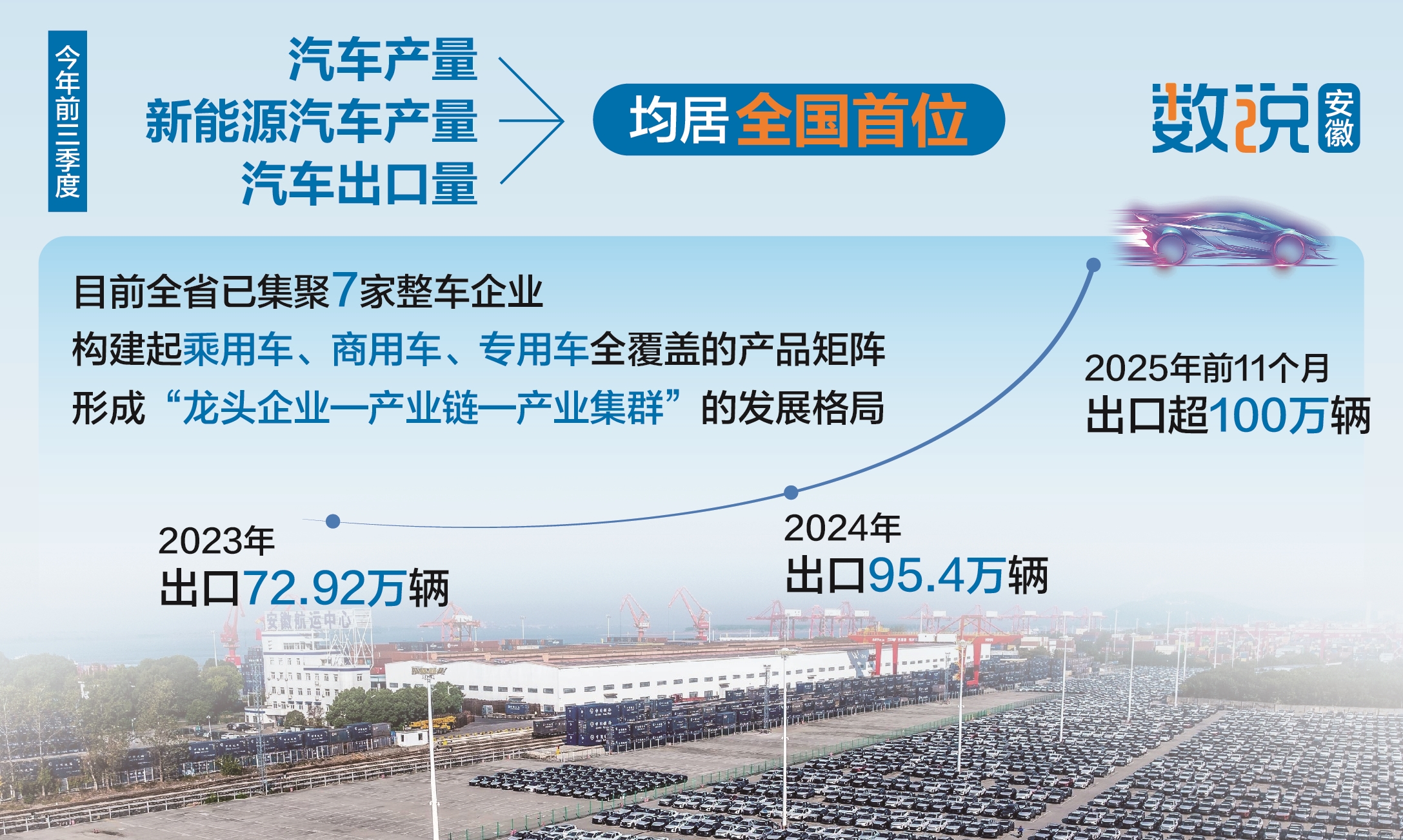 从2023年出口汽车72.92万辆,到2024年全年出口95.4万辆,再到2025年前10个月出口93.8万辆,现如今这一数字已经来到了100万辆……在中国汽车工业的版图上,安徽无疑是个低调的“上进生”,一路加倍努力、默默速行,终至当下受到广泛关注。