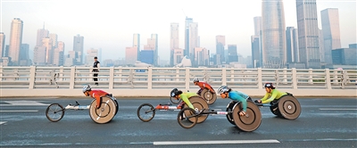 残特奥会女子全程马拉松T54级参赛选手在比赛中。