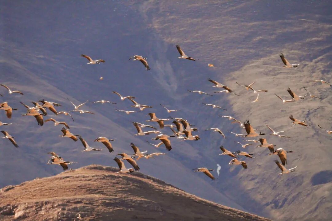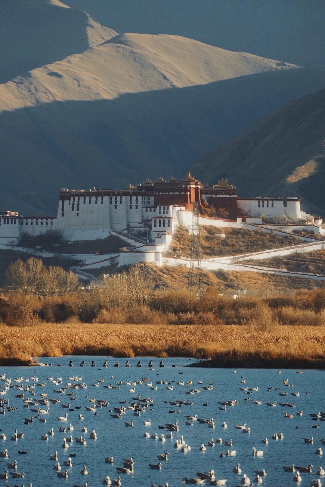 布达拉宫巍然耸立与结冰的水面构成一幅静谧的冬日画卷。这里是候鸟越冬的天堂,黑颈鹤、斑头雁等候鸟在此栖息,为湿地增添了无限生机。