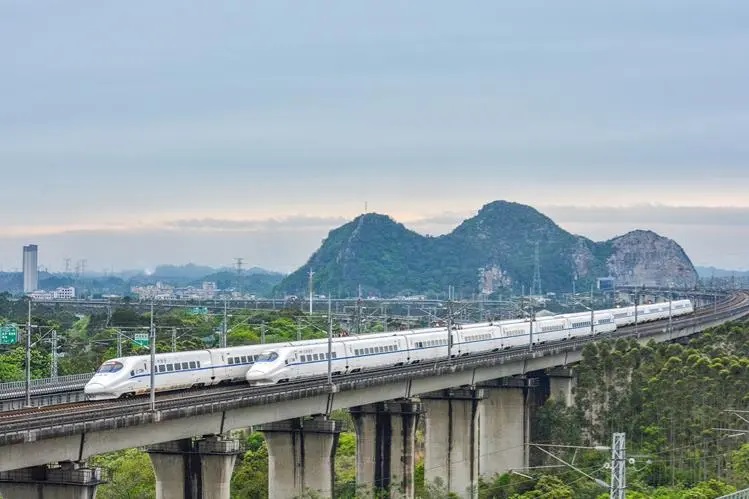 看,高铁也会“赛车”!晴空之下,两列高铁列车如银色的箭矢,在城市的脉络中并肩疾驰。身后是错落的现代楼宇与葱郁的绿意,钢铁的速度感与都市的烟火气在此刻交融,仿佛正驶向同一个充满生机的远方。