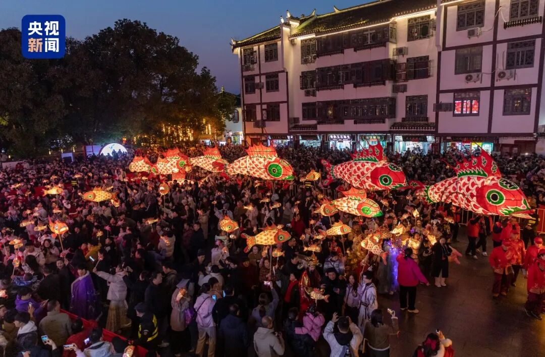 在三河古镇,春晚分会场取景点的精美置景都被完整保留了下来,惊艳了无数人的鱼灯巡游盛景,也变成了春节期间的限定文旅产品。