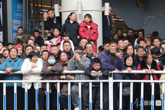 巡游沿途,观众呼朋引伴、摩肩接踵,欢呼声、喝彩声此起彼伏。大家纷纷拿出手机、相机记录精彩瞬间,大人小孩脸上都洋溢着新春的喜悦,不少市民跟着队伍一路前行,沉浸式体验社火巡游的热闹。