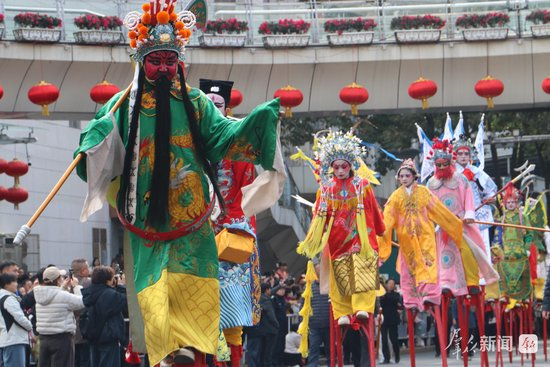 2月27日,演员在社火巡游中进行高跷表演。
