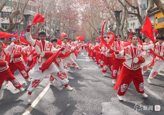 2月27日,演员在社火巡游中进行腰鼓表演。