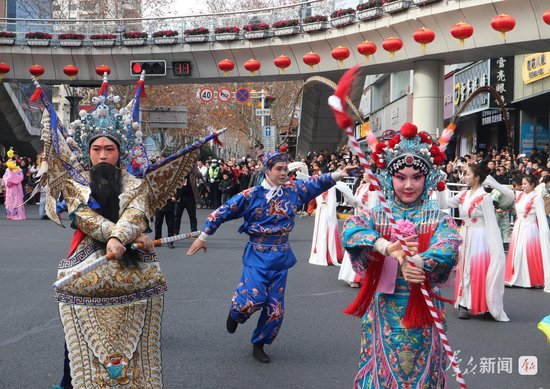 2月27日,演员在社火巡游中进行汉调二黄表演。