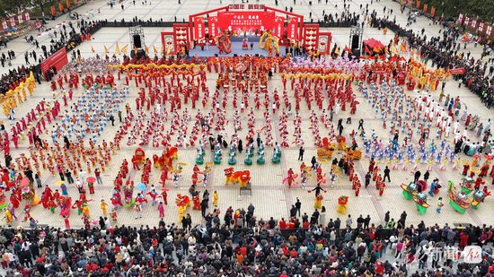 舞龙的汉子们擎着金龙狂奔腾跃,龙身随着绣球翻飞,在阳光下划出道道弧线;踩高跷的艺人足蹬三尺木跷,时而扭起秧歌步,时而俯身与路边孩童击掌;彩莲船的“船娘子”碎步轻移,艄公手握船桨在前逗趣,一唱一和间,汉江边的渔家风情跃然眼前……社火队员们身着五彩斑斓的服饰,踩着鼓点旋转、跳跃,耍出新年精气神。