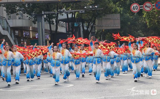 2月27日,演员在社火巡游中进行舞龙表演。