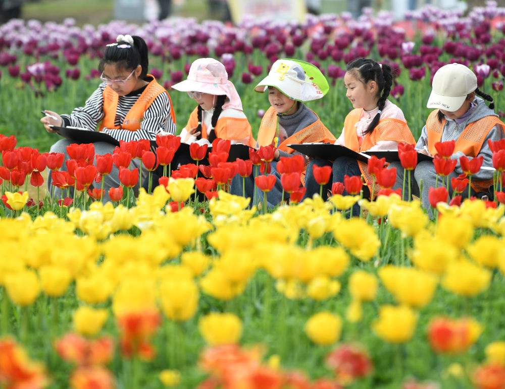 4月1日,在安徽巢湖经济开发区半汤郁金香高地,小朋友参加春假写生活动。新华社发(马丰成摄)
