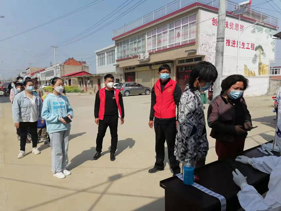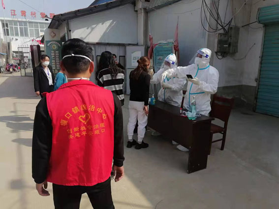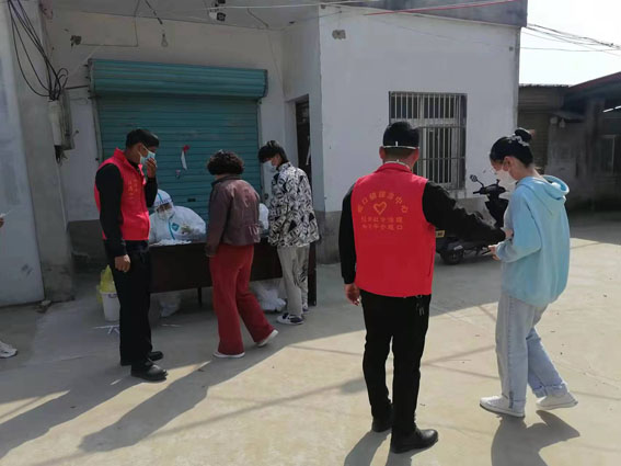 图为:寿县堰口镇综治部门综治志愿者在江黄村酸采样现场维持秩序。