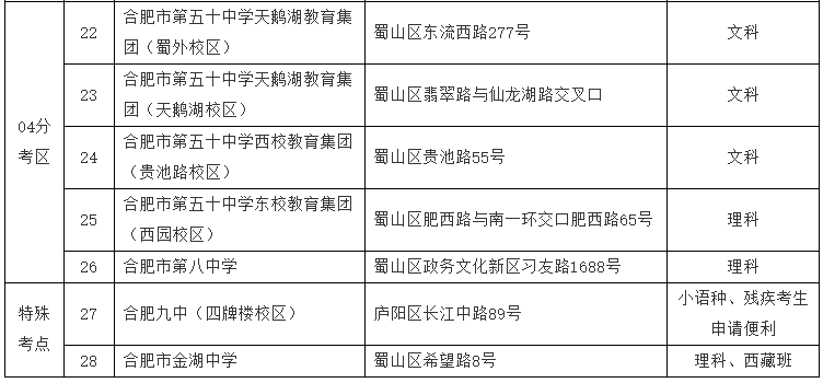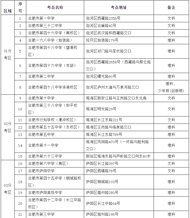 今年合肥市市区高考考点继续实行相对就近编排。广大考生已于4月26-28日依据高考所在报名点学校或实际居住地所在的行政区域选择了对应分考区。目前市区高考考点遴选工作已完成。