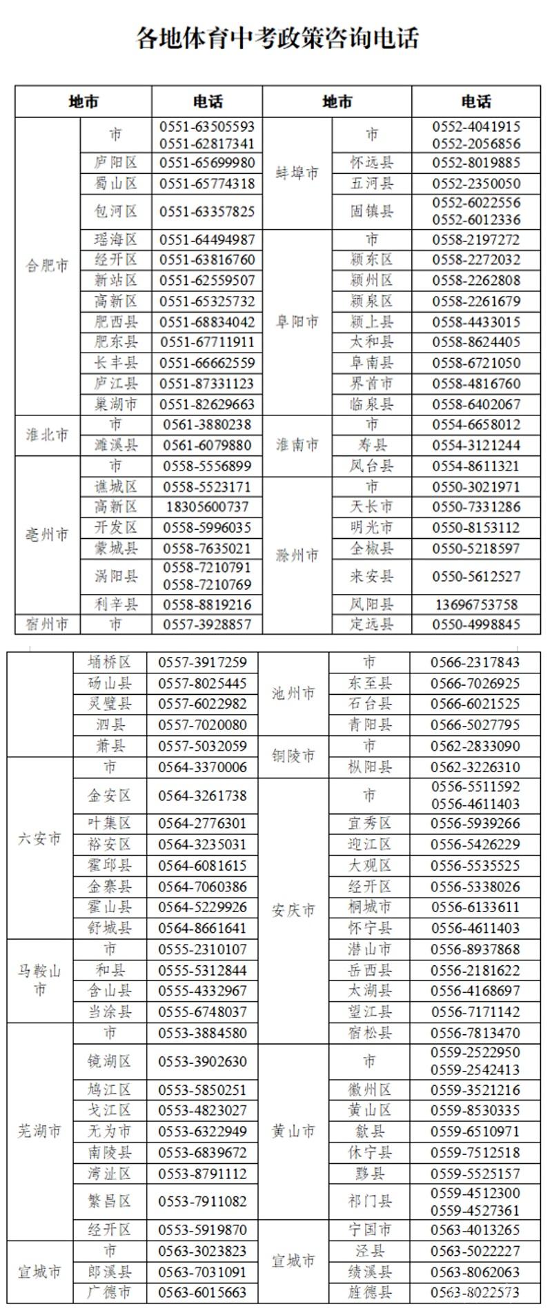 三、精心做好服务保障。各地要针对外地考生参加体育中考制订相应的工作举措,在考场组织、时间安排、疫情防控等方面予以关心,精心做好服务保障。严禁层层加码,不得有歧视性的考试措施。考生回户籍所在地参加体育中考,须提前了解并严格遵守属地疫情防控政策。各市(县、市)体育中考政策咨询电话见附件。