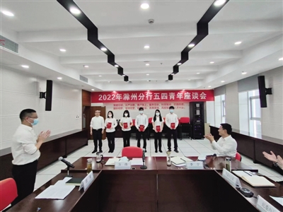 5月6日,工行滁州分行召开青年员工座谈会,党委书记、行长方伟为荣获2021年度共青团“五优”表彰人员颁奖。