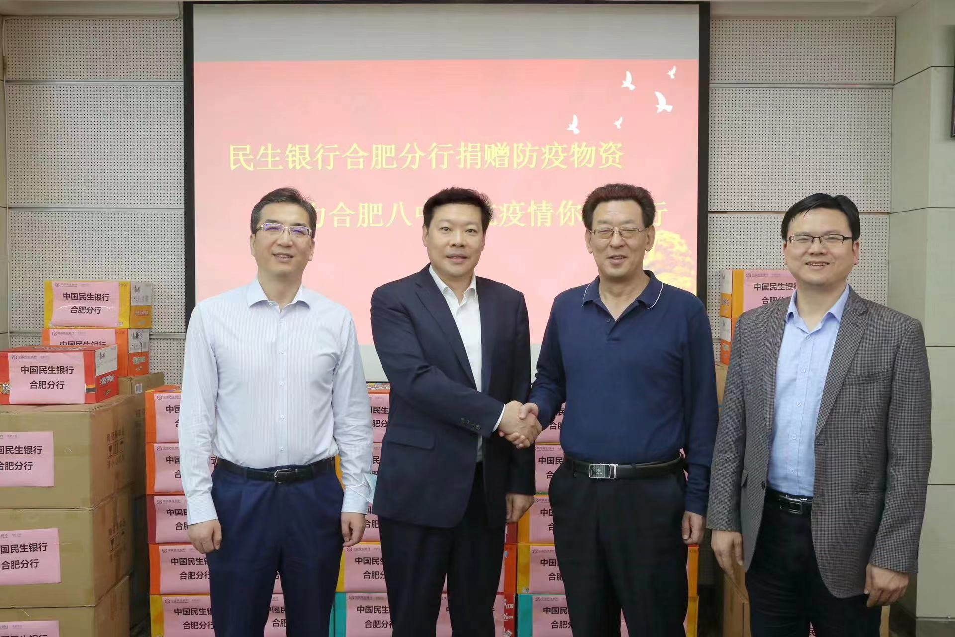 为凝聚合力,共克时艰,群防群控应对疫情,5月19日上午,中国民生银行合肥分行助学防疫物资捐赠仪式在合肥市第八中学圆满举行。中国民生银行合肥分行党委书记、行长孔庆龙,合肥市第八中学党委书记、校长杨开仁出席仪式。中国民生银行合肥分行副行长鹿军及有关部门负责人,合肥八中副校长余俊及相关管理处负责人,民生银行合肥政务区支行行长周晶晶等参加捐赠活动。