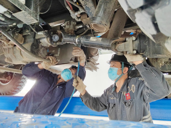 图为刘庄煤矿西区运输区职工检修井下无轨脚轮车现场