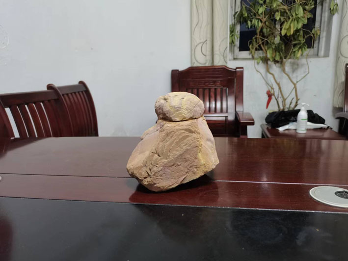 卡口摆放多个提示牌,因为有时候有大风,每个牌子都用几个砖头或者石头压着,防止牌子被风刮倒,每天车来车往都会刮倒数次。一天我在执勤中、一阵风来、将一块牌子刮倒。我走过去、随手将牌子扶正,又顺手搬砖头来固定牌子。当摸到一块布满泥灰的石头,拿起手感较重,有点形状,顿觉有趣。时值中午换岗吃饭,将石头冲洗后,放在办公室,自己觉得很顺眼,心生欢喜,随手拍了一张照片,去到卡口将照片给卡口工作人员看,都对其感到惊叹。我内心也无比高兴,我明白他们肯定在想:“这石头平常就是用来压牌子的,一直在我们跟前,没想到这石头也会有它的亮点。”