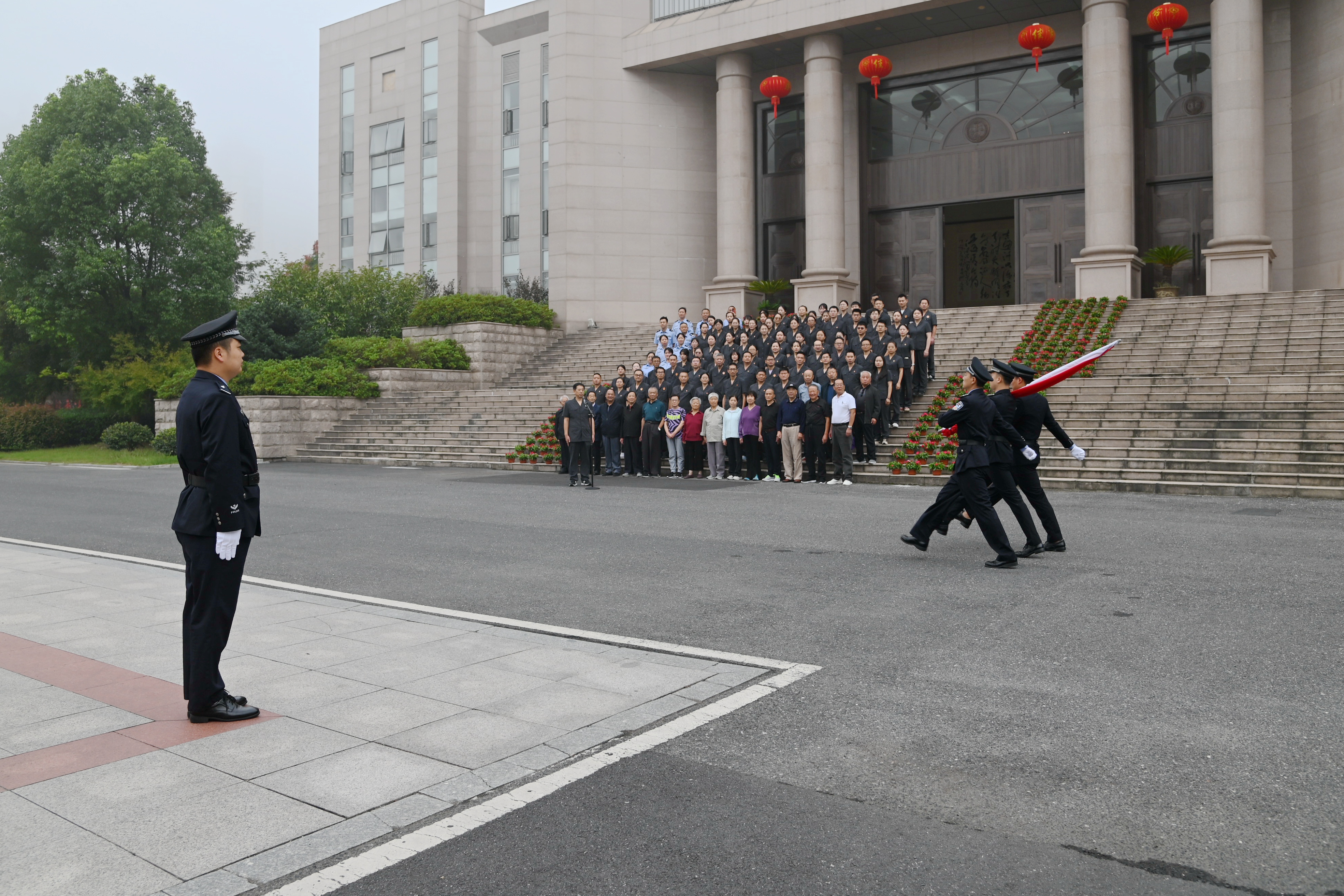 审判大楼前,院领导班子成员和全体干警整齐列队,仪式还特别邀请了单位退休老干部参加,大家精神饱满,共同向国旗致敬。英姿飒爽的国旗护卫队迈着铿锵有力、整齐坚定的步伐,护卫着五星红旗走上升旗台。