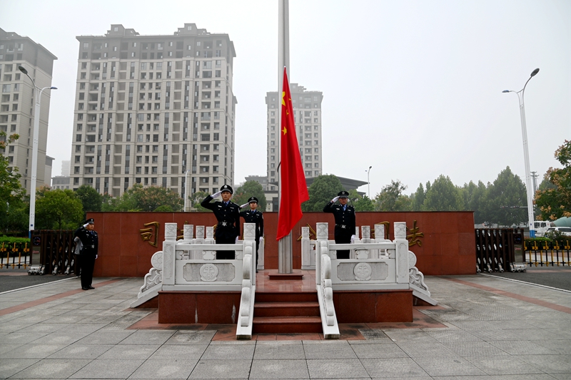 在雄壮的国歌声中,鲜艳的五星红旗冉冉升起。全院干警怀着对祖国的崇高敬意高唱国歌,肃立向国旗行注目礼,表达对祖国的深深热爱和美好祝福。庄严的国歌声,飘荡在法院上空,激荡着每一个干警的心怀。