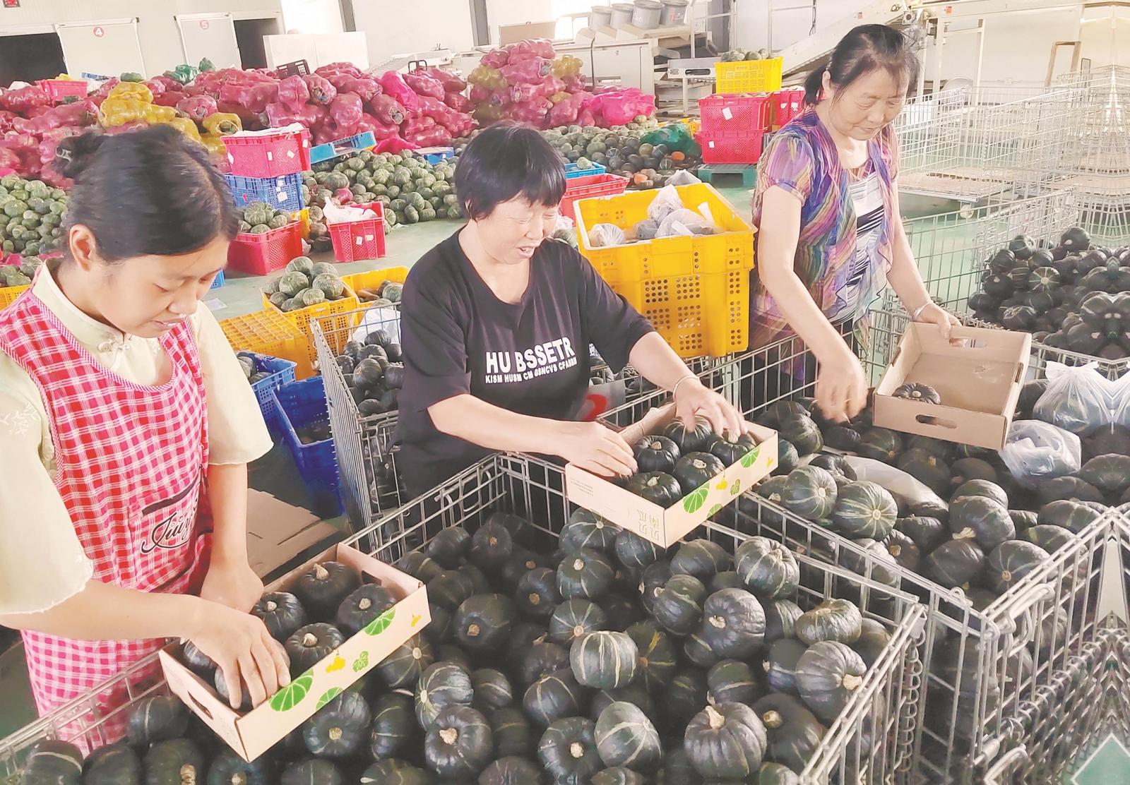 6月9日,在长丰县吴山镇楼西村岸念公司,工人正包装网上销售的小南瓜。近年来,当地流转1100亩土地,由安徽岸念等5家农企发展南瓜、秋月梨、火龙果等特色种植,带动群众家门口就业增收。本报通讯员 杜 刚 摄
