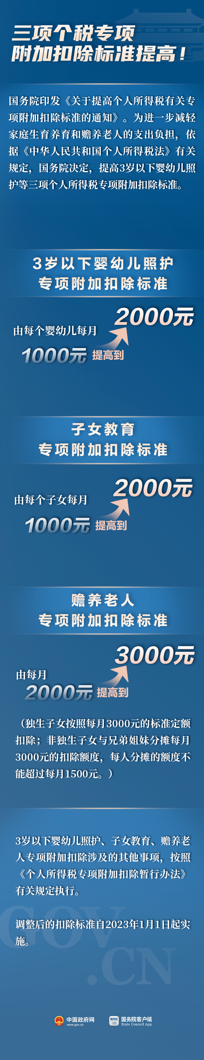 自2023年1月1日起,3岁以下婴幼儿照护专项附加扣除标准,由每个婴幼儿每月1000元提高到2000元;子女教育专项附加扣除标准,由每个子女每月1000元提高到2000元;赡养老人专项附加扣除标准,由每月2000元提高到3000元,其中独生子女按照每月3000元的标准定额扣除,非独生子女与兄弟姐妹分摊每月3000元的扣除额度,每人分摊的额度不能超过每月1500元。通知发布后,纳税人在9月份纳税申报期可按提高后的扣除标准执行,也可以在2023年度个人所得税汇算清缴时执行。
