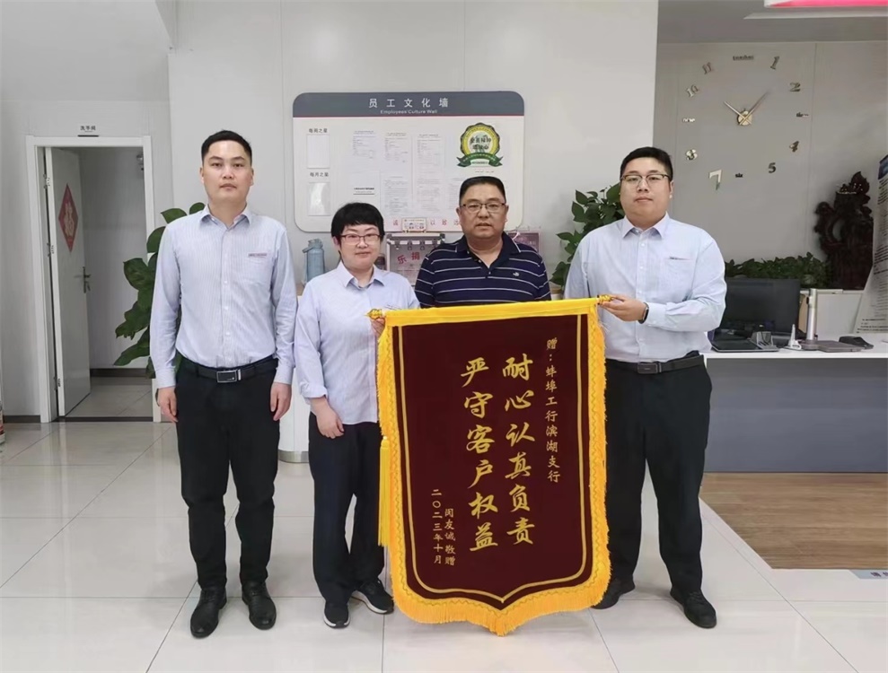 10月16日,老人之子闵先生再次来到网点,向工作人员表达了诚挚的感谢,并向工行蚌埠滨湖支行赠送“耐心认真负责,严守客户权益”的锦旗。