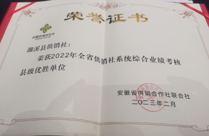 市场星报、安徽财经网(www.ahcaijing.com) 、掌中安徽讯(朱瑞秋)在2023年全省供销社三届四次理事会议暨三届五次监事会议上濉溪县供销合作社联合社荣获2022年度全省供销社系统综合业绩考核县级优胜单位荣誉称号,并作为县级代表进行经验交流发言。