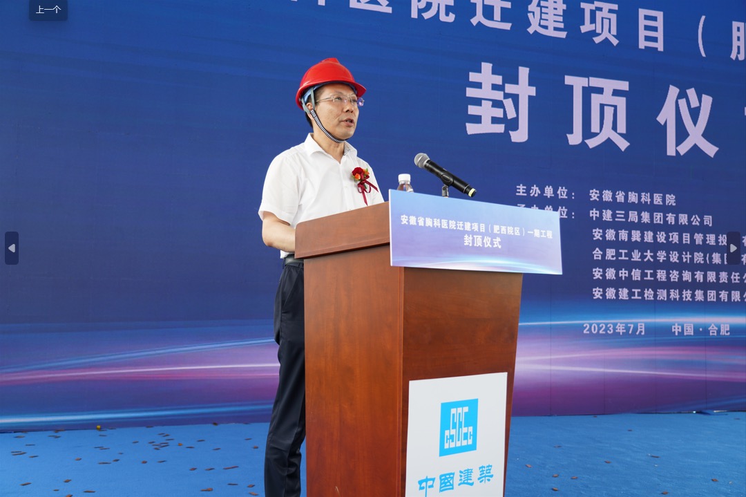 党委书记马冬春在封顶仪式致辞中表示,肥西院区一期项目主体封顶,不仅代表着建设项目取得阶段性的胜利,更是对我院建院41周年的珍贵献礼。从一纸蓝图到主体封顶,项目建设得到了省发改委、省财政厅、省卫生健康委、肥西县委县政府的大力支持,受到了社会各界的广泛关注。院(所)全体干部职工与项目各参建单位齐心协力,克服种种困难,在确保质量与安全的前提下,取得了今天这一重要的阶段性成果,也为实现竣工验收并投入使用奠定了坚实基础。他表示院(所)党委将以此为契机,充分调动各方积极性,凝心聚力,高质量、高速度完成后续建设工作。