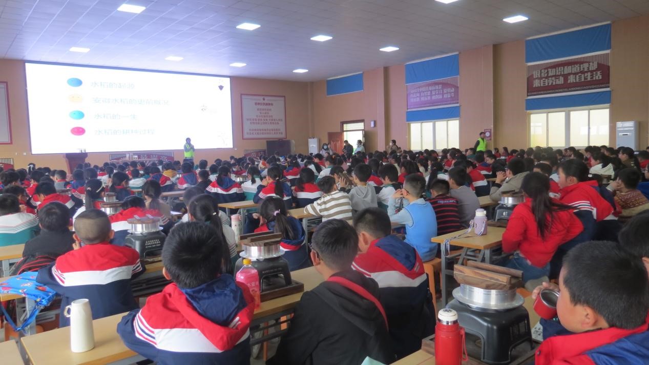 科普大课堂:同学们认真听讲,仔细研读,学习中国农耕历史发展和现代农业知识,了解“五谷”水稻、小米、高粱、麦子、大豆,探寻一粒米的“前世今生。”