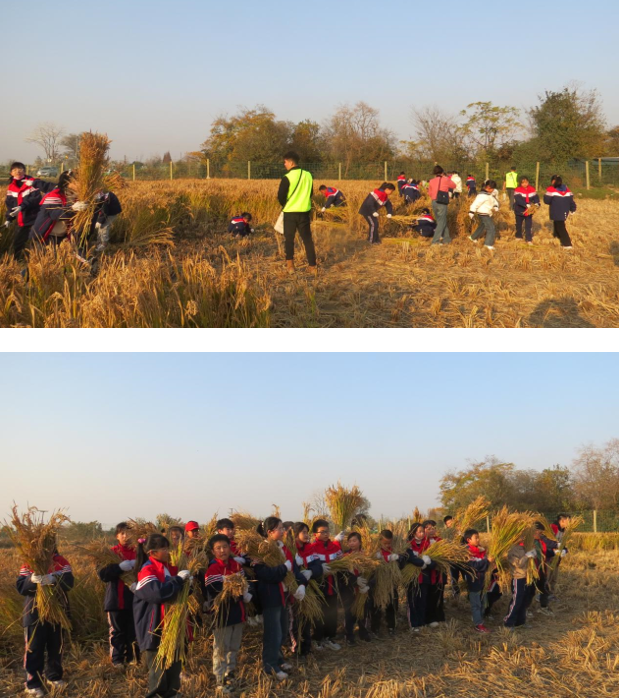 拾稻穗:收工前,同学们来到稻田、田埂、打谷场周边,搜索前进,仔细寻找,将割稻以及稻把传送过程中散落的稻穗捡拾起来,确保“颗粒归仓”。