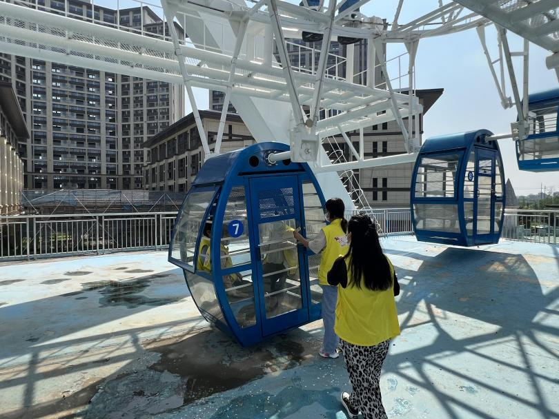 随着演练开始,一台摩天轮设备在运行中突然发生故障,4名游客被困。发生情况后,现场工作人员立即逐层上报,封锁游乐设施进出口,防止有围观群众闯入发生二次伤害,并做好游客安抚工作。