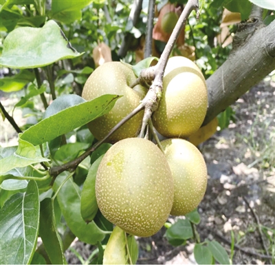 据了解,黄金蜜梨果肉细腻、汁多、口味香甜,个头总体比较适中,每个梨的重量在7两左右。据介绍,为了保证每一个梨都是精品,每棵梨树产量都控制在50个梨左右,远远望去,一棵棵枝繁叶茂的梨树被翠绿色的梨儿压弯了枝头。为了防止梨掉落,对于个头较大的梨还会用绳子固定一下。