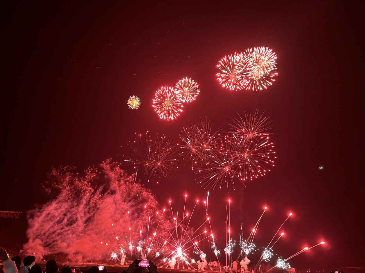夜幕降临,度假区里人山人海,不少游客早早等候在最佳观赏区。夜空为幕、焰火作笔,晚七点,在人们的期待中,一束束耀眼花火响彻云霄,在夜空中绚丽绽放。山形、扇形、烟花瀑布等近万发造型各异的礼花依次发射,五彩斑斓、美仑美奂。现场村民与游客纷纷拿起手机记录下这一浪漫时刻,共同表达对新年的美好祝福。