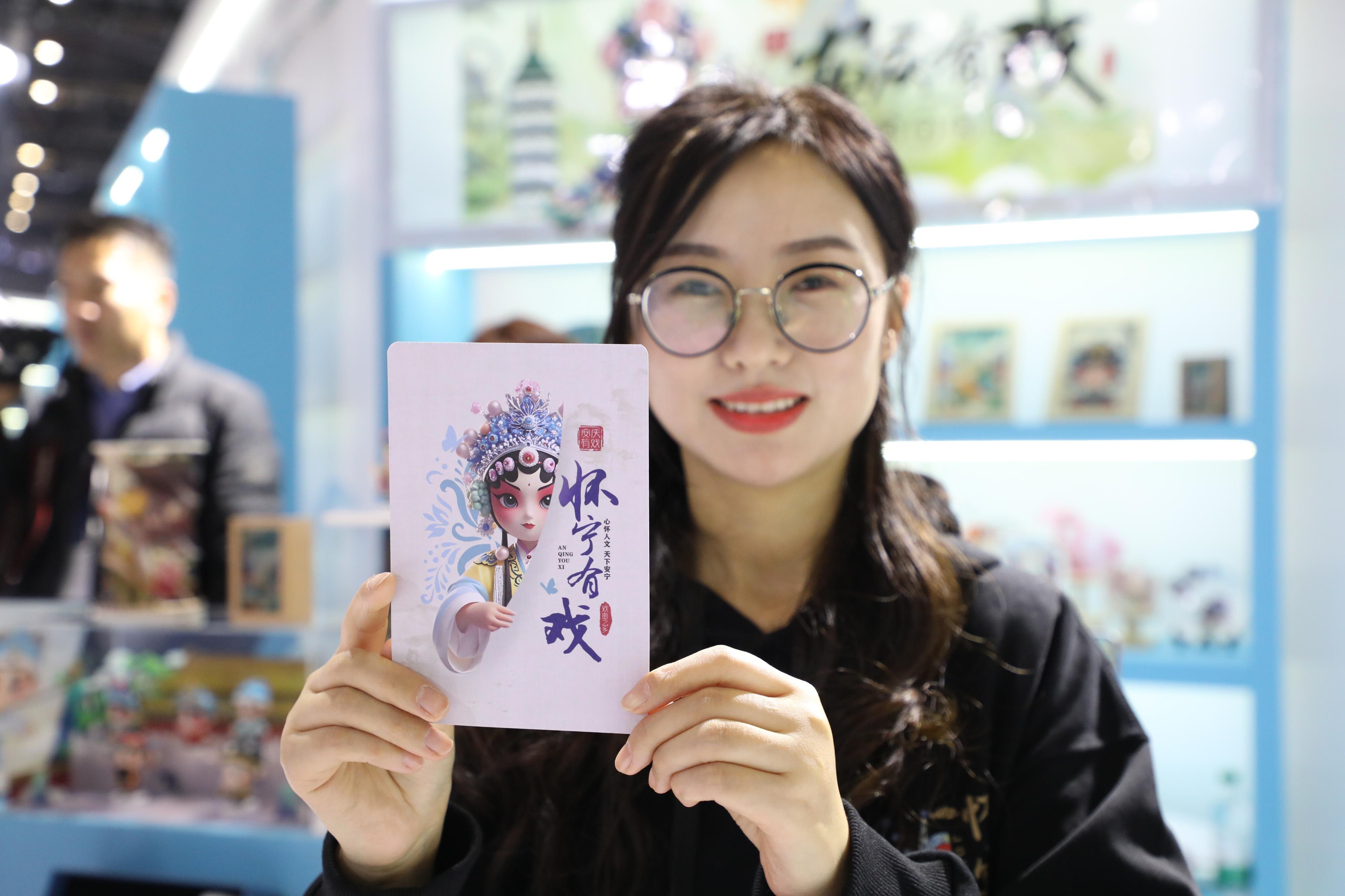 11月22日,在安徽馆内,参观者展示购买的黄梅戏文创贺卡。本报记者 李 季 摄