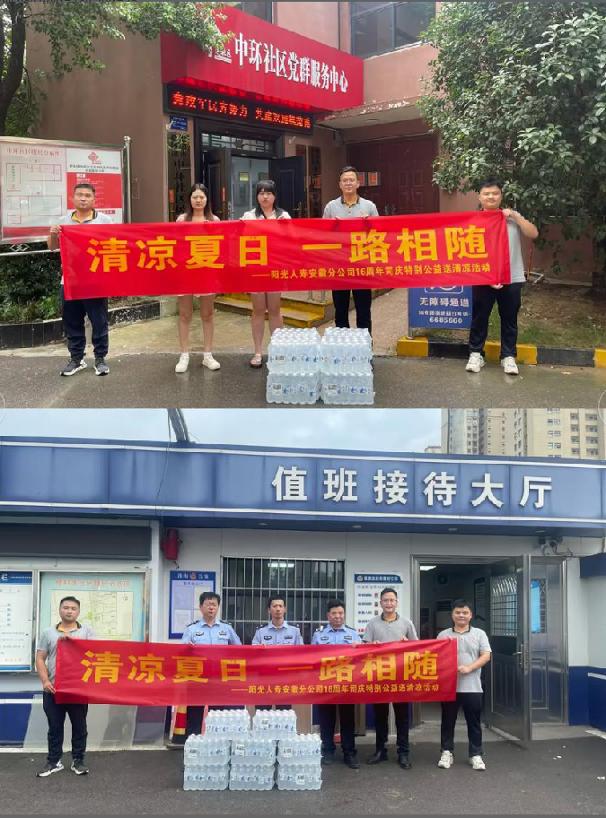 践行企业责任担当,不断传递正能量,值阳光人寿安徽分公司成立十六周年之际,8月14日,淮南中支走进该市中环社区及舜耕派出所开展“清凉夏日一路相随”阳光人寿安徽分公司16周年司庆特别公益送清凉活动,为工作在一线的劳动者送上夏日清凉,让他们在酷暑中感受到丝丝凉意。