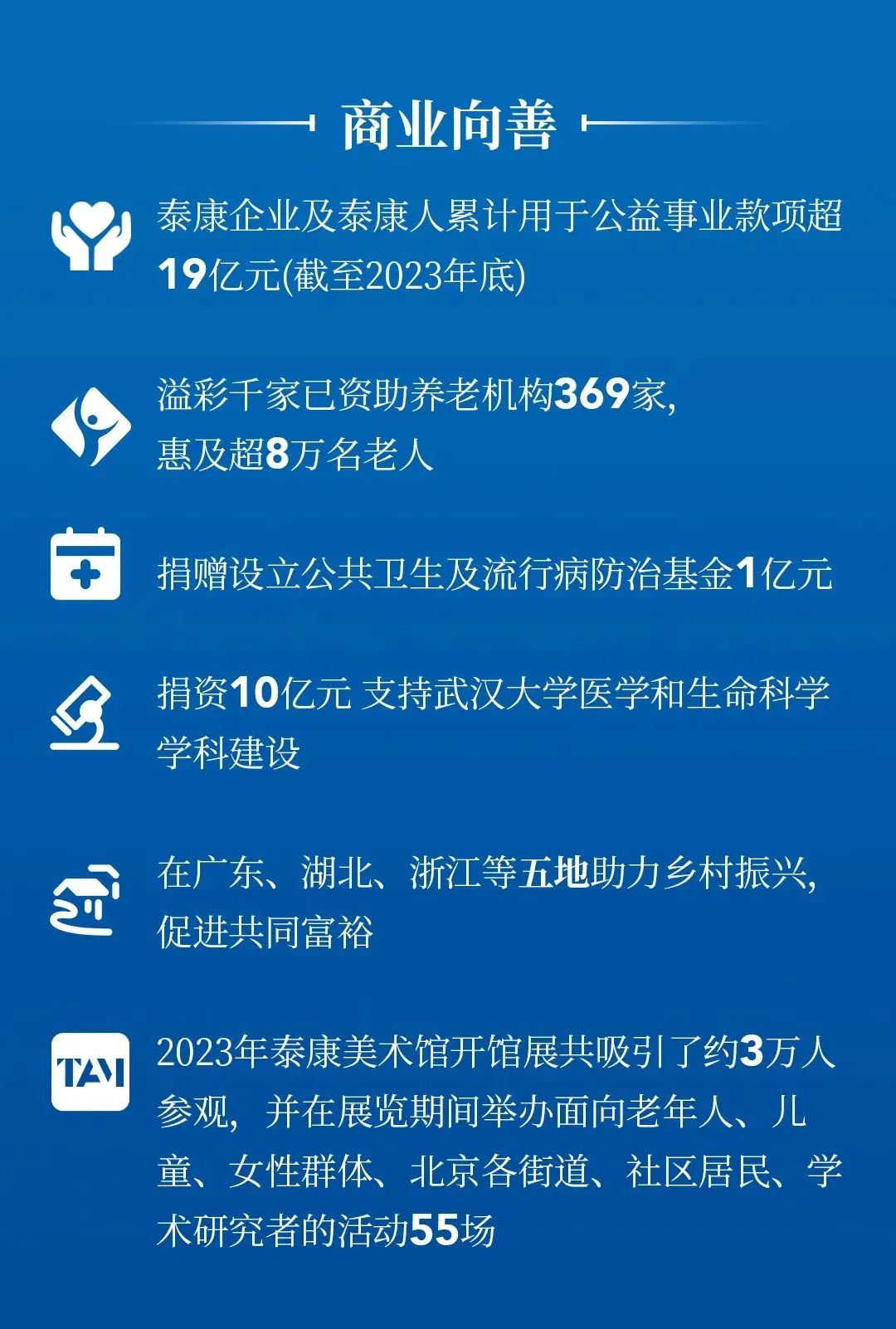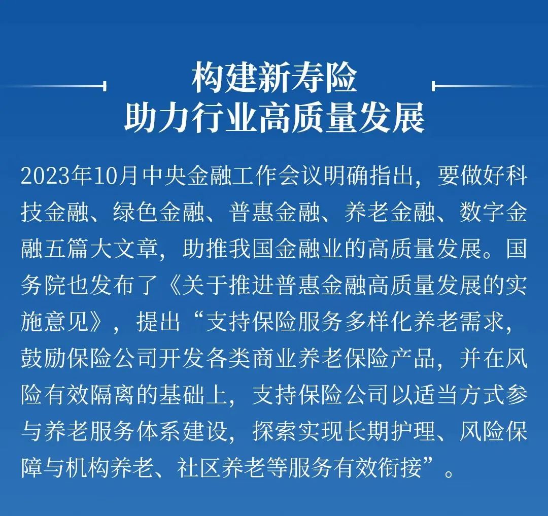 泰康保险集团发挥耐心资本的优势,写好金融五篇大文章,坚定服务国家战略、服务实体经济、服务民生。泰康积极变革寿险传统的生产方式,将虚拟的保险与实体的医养服务相结合,将传统寿险业的“负债+投资”的二维结构转为“支付+服务+投资”三端协同的“新寿险”模式,培育新质生产力,为行业的高质量转型提供了方向和路径。