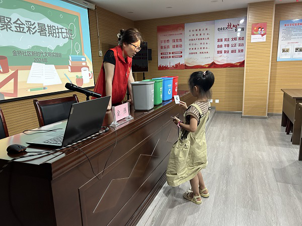 本次托管课程设置了手工DIY、科普知识宣传、课业辅导等多个板块,并围绕垃圾分类知识开展专题讲座。大学生志愿者们通过生动有趣的图片和视频,向孩子们详细介绍了垃圾分类的基本知识、分类标准和重要意义,孩子们听得津津有味。随后,志愿者以有奖问答小游戏的形式,加深孩子们对垃圾分类相关知识的认识。活动现场孩子们积极参与、争相举手回答问题,激发了孩子们对环保的浓厚兴趣。在丰富多彩的课程中,孩子们不仅学习到了新技能,更重要的是学会了耐心、合作与分享。一天托管下来,家长们也纷纷表示,这样的社区服务极大地帮助他们解决了工作与照顾孩子之间的矛盾。目前,该暑期公益托管班已接收了20余名儿童。