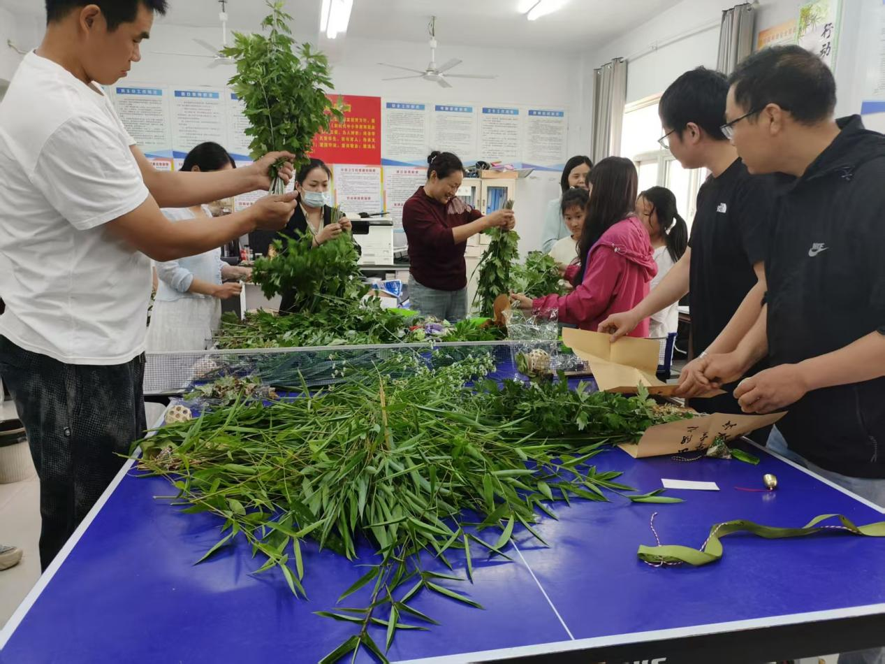 中高年级的学生在教师们的耐心指导下与教师们一同专注于制作艾草花束,将新鲜艾草与菖蒲捆扎成束,用彩色丝带缠绕装饰。“艾草有驱虫辟邪的寓意,做成花束既美观又能让孩子们感受传统习俗。”指导老师宋老师一边演示一边讲解,花束完成后被悬挂在教室门口,淡淡艾香弥漫校园。活动结尾,指导老师还为学生们讲述了端午起源与习俗,通过互动问答加深对传统文化的认知。