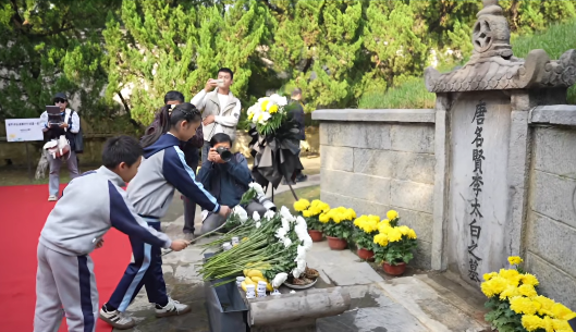仪式核心环节,嘉宾们有序走近“唐名贤李太白之墓”,俯身洒酒、敬献野菊,行三鞠躬礼后绕墓一周。成都来客带来醇厚郎酒,廊坊宾客则携来本地黄酒,不同地域的馥郁酒香在空气中升腾,与众人的追思交织,尽显肃穆。“青山不老,明月常新,只要还有人读诗,李白就永远不会孤独。”四川文理学院青年教师王欣璐的感慨,道出了众多参与者的心声。