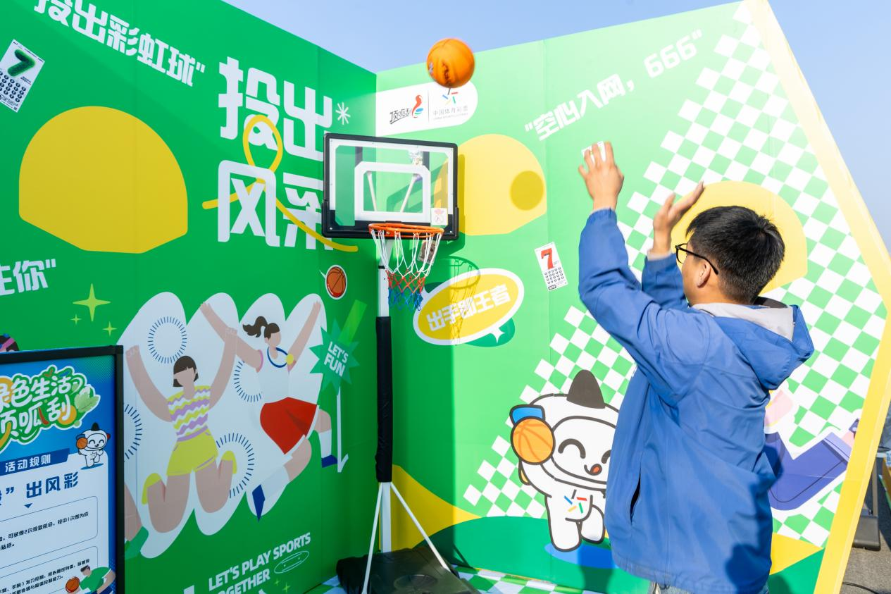 专区内,“投出风彩”“跳出精彩”“哐动出彩”等低碳体育游戏区前,参与者通过趣味投篮、跳高挑战、保龄球击打等体验,既能感受运动乐趣,又能赢取体彩定制帆布包等精美礼品,让绿色生活从抽象概念变为可感可触的快乐体验。