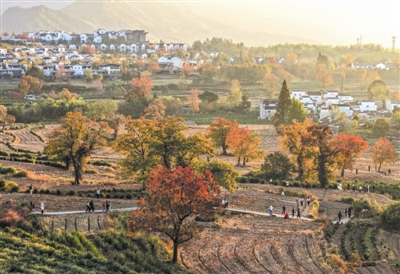 初冬时节,安徽省黄山市黟县宏村镇卢村晨雾缭绕,色彩绚丽的乌桕树与白墙黛瓦的徽派古村落交相辉映,构成一幅诗意盎然的乡村画卷,吸引众多游客前来观赏。施亚磊 韩丹妮 文/图